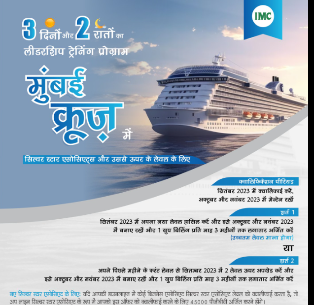 अगला ऑफर है मुंबई क्रूज ऑफर ऑफर सिल्वर स्टार एसोसिएट और ऊपर के लेवल के लिए है इसका क्वालिफिकेशन पीरियड सितंबर 2023 में क्वालीफाई करना है और अक्टूबर तथा नवंबर 2023 में मेंटेन करना है सितंबर 2023 में अपना नया लेवल हासिल करना है और इसे अक्टूबर और नवंबर 2023 में मेंटेन करना है और एक ग्रुप बिलिंग प्रतिमा 3 महीने तक लगातार करनी है दूसरी शर्त यह है कि अपने पिछले महीने के करंट लेवल से सितंबर 2023 में दो लेबर ऊपर अपडेट करना है और इसे अक्टूबर और नवंबर 2023 में मेंटेन करना है और एक ग्रुप बिलिंग प्रतिमा 3 महीनों में लगातार करना है